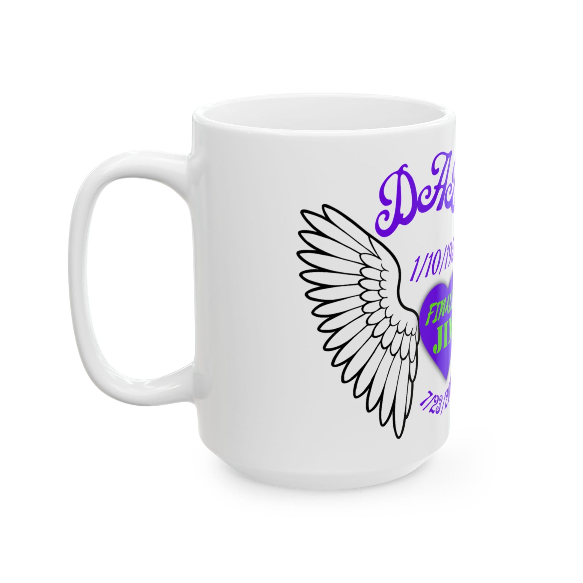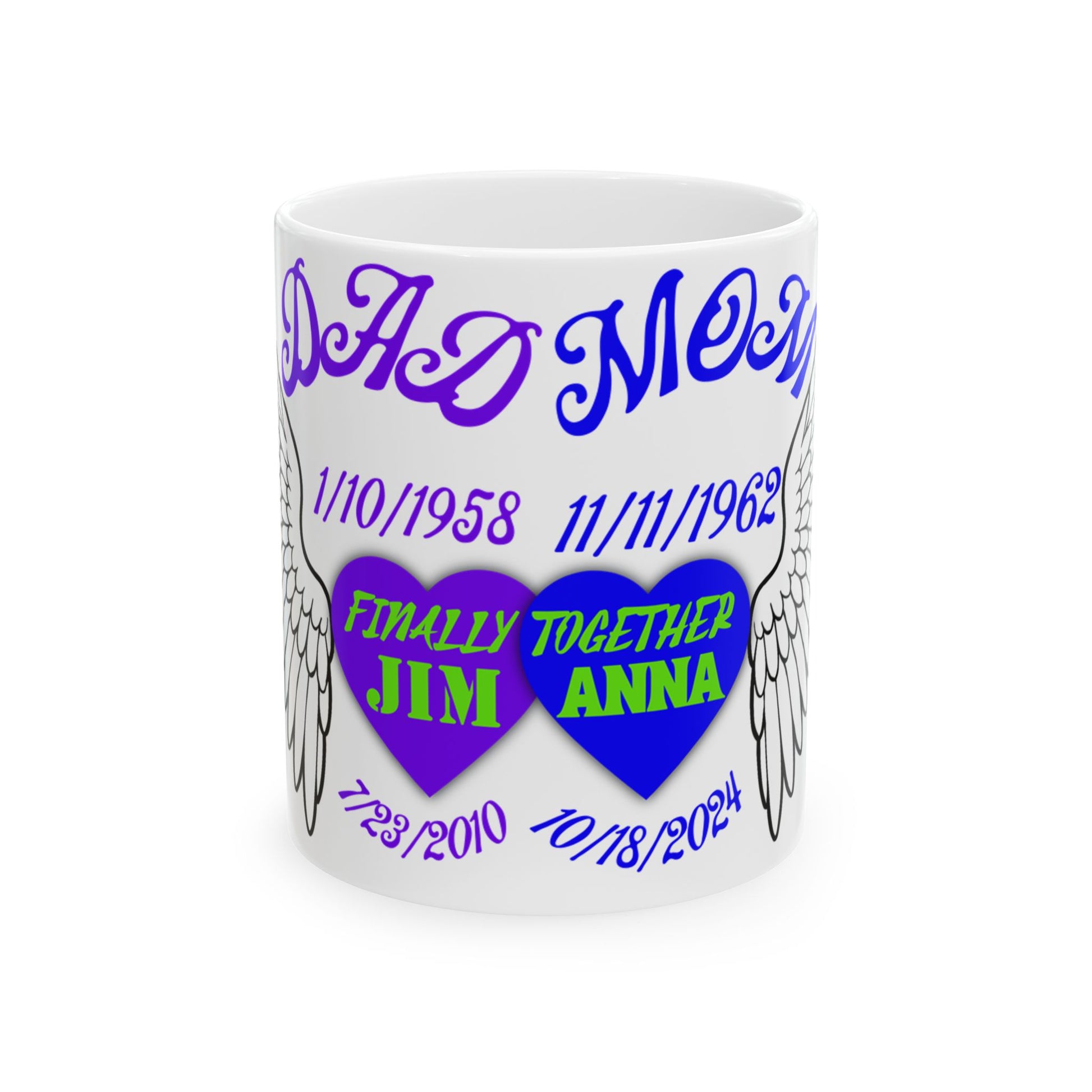 Embrace warmth and memories with this beautifully designed ceramic mug. The glossy finish and vibrant colors come together to create a striking piece that’s perfect for anyone who cherishes meaningful moments. Ideal for morning coffee, evening tea, or as a commemorative gift, this mug adds a personal touch to every sip. It’s perfect for birthdays, anniversaries, or as a heartfelt memorial piece. The comfortable C-handle ensures easy handling, making it a great gift for loved ones or a treat for yourself. Whether you're celebrating a milestone or simply enjoying your daily brew, this mug is a wonderful reminder of love and togetherness.